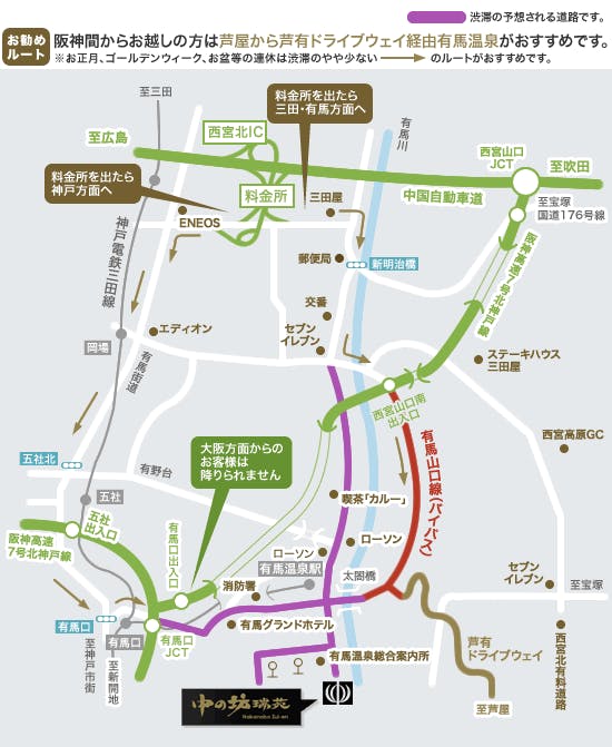 - あり(無料)神戸電鉄・有馬温泉駅、阪急バス/JRバス・有馬温泉バス停より送迎バス有り。(駅、バス停到着後要連絡)