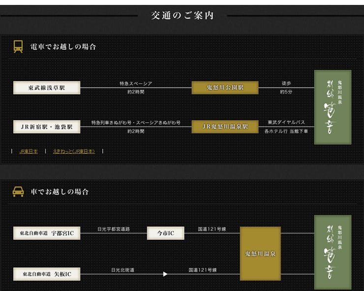 ・東武浅草線=東武日光線特急スペーシア(120分)=鬼怒川公園駅=徒歩8分もしくは無料送迎バス(※要予約)=当館
