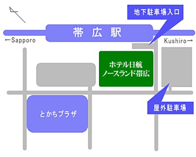 JR帯広駅隣接 徒歩1分 ■飛行機の場合 帯広空港からお車で約30分 空港直行バスがホテル前より発着しております。 ■お車をご利用の場合 札幌から約3時間(高速道路利用) 釧路から約2時間