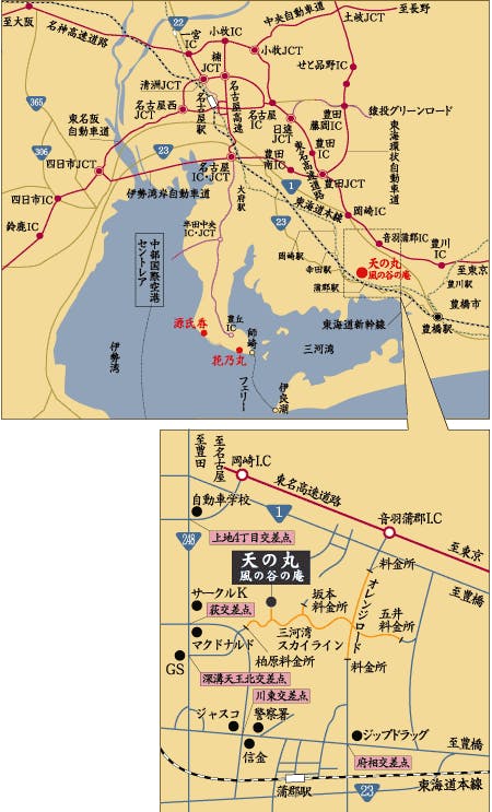 ■東京方面から 東名高速道路 音羽・蒲郡インターチェンジからオレンジロードに進み府相交差点を右折し、蒲郡警察署先の川東交差点を右折し、三河湾スカイラインへ。