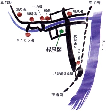 ■神戸・大阪方面より 中国道~舞鶴道「春日」~北近畿豊岡自動車道~豊岡出石IC 国道312号線~県道3号線で円山川沿いを北上(ICから約30分) ■姫路方面より ・播但有料道路・和田山~(R312)~(一本柳交差点直進)~(右岸道路)~出石(いずし)~(R426)~豊岡~城崎温泉 ■京都方面より ・京都~(R9)~福知山~(R9)~(野花交差点右折/出石方面)~(R426)~豊岡~城崎温泉 ■岡山方面より 山陽自動車道・姫路東I.C~播但有料道路・和田山~(R312)~(一本柳交差点直進)~(右岸道路)~出石(いずし)~(R426)~豊岡~城崎温泉 ■鳥取方面より R9・R178~日本海沿いマリンラインをご利用下さい。