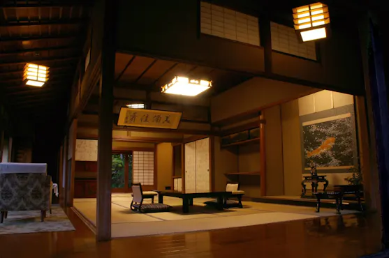 これまでも多くの著名人をお迎えしている、特別室「はなれの間」は、全部で20帖の厳格な書院造りで、廻り廊下に囲まれています。「野口英世」による「美酒佳肴」の墨書も飾られています。また専用の浴室がついていて、もちろん源泉100%掛け流しの湯が、いつでも浴槽から溢れています。