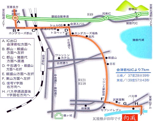 ■お車で 東北自動車道、郡山JCTより磐越自動車道の会津若松・新潟方面へ-会津若松ICでおり、49号国道、飯盛山を通過、瓦屋根が目印。 (浦安から約3時間/仙台から約2時間) ■電車で JR東北新幹線・郡山駅で乗り換え-磐越西線・会津若松駅下車、路線バス鶴ヶ城・飯盛山線にて終点下車徒歩1分 (東京駅から約2時間30分/仙台駅から約1時間30分)