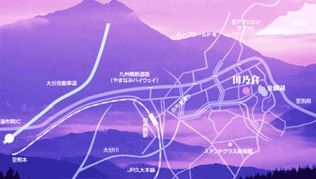大分空港‥‥大分空港道路・速見I.C約30分‥‥別府‥‥九州横断道路約30分‥‥湯布院・約1時間