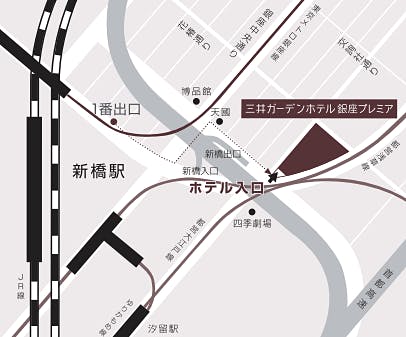<電車にて> ○東京メトロ銀座線「新橋駅」1番出口より徒歩4分 ○東京メトロ銀座線「銀座駅」A3番出口より徒歩7分 ○JR「新橋駅」銀座口より徒歩5分 ○ゆりかもめ「新橋駅」より徒歩5分 ○JR東京駅八重洲口よりタクシーで約10分 <お車にて> ○首都高速(環状線)銀座・新橋ランプより各3分 ○新橋方面から首都高速出口「新橋」から3分 ○横浜レインボーブリッジ方面から首都高速出口「汐留」から5分