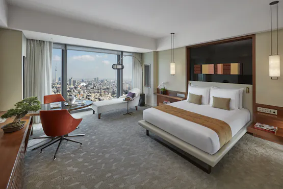 タワーの30階から36階を占め、都内を一望するゲストルームは全179室。東京の真ん中から関東平野を全方位に見晴らす、まさに“現代の天守閣”のような絶景が眼下に広がります。東向きのお部屋からは東京の地平線に屹立する東京スカイツリー®、さらには隅田川から東京湾が、西向きのお部屋からは大手町・丸の内や皇居の緑をはじめ、新宿副都心から箱根の山道へ。いずれのお部屋もゆったりとした広さで、落ち着きのある空間です。スタイリッシュな中にも日本の伝統と気品を醸し出す至高の空間が、くつろぎに満ちた特別なひとときをお届けいたします。