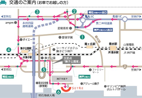 ・JR神戸線 舞子駅より 徒歩約7分 ・山陽電鉄 舞子公園駅より 徒歩約7分 ・第2神明 高丸ICより 車で約10分
