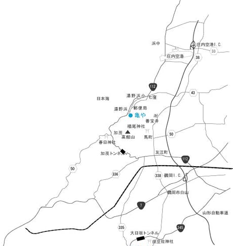 電車で 羽越本線鶴岡駅下車バス40分・タクシー20分 飛行機で 庄内空港利用 空港よりタクシー10分 お車で 新潟より約3時間 長岡より約4時間 秋田より約3時間 仙台より約2時間30分 山形自動車道鶴岡ICより約20分 庄内空港ICより約10分 日本海東北自動車道朝日まほろばICより約1時間30分