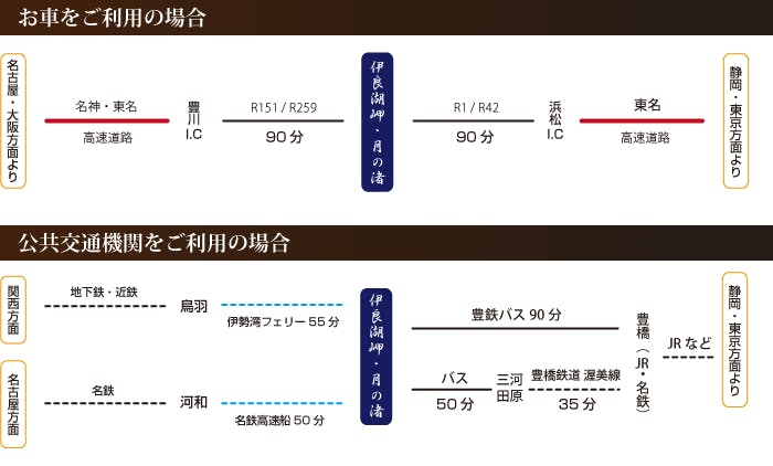■電車・バスにて JR豊橋駅より豊橋鉄道バス(伊良湖岬行き)で90分、恋路ヶ浜下車、徒歩2分 ■お車にて 東名高速道路~豊川IC~R151を伊良湖方面へ、R259経由で約80分