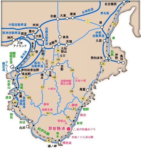 ■JR紀勢本線紀伊勝浦駅より徒歩約10分、南紀白浜空港から紀伊勝浦駅はリムジンバスで115分。