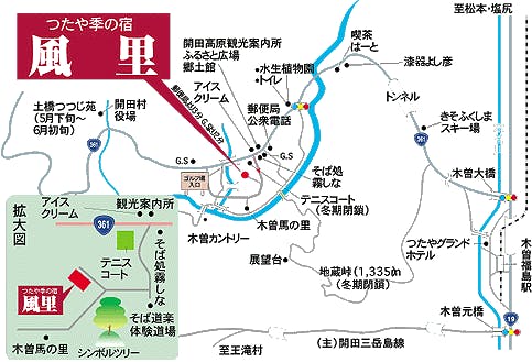 ■電車の場合 名古屋から中央西線特急1時間40分。木曽福島~R361(バス30分)開田高原風里下車 ■お車の場合 名古屋~中央自動車道(50分)~中津川I.C~R19(1時間10分)~木曽福島~R361(20分)~開田高原風里 東京~中央自動車道(3時間)~伊那I.C~R19(1時間)~木曽福島~R361(20分)~開田高原風里