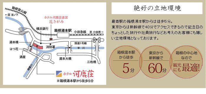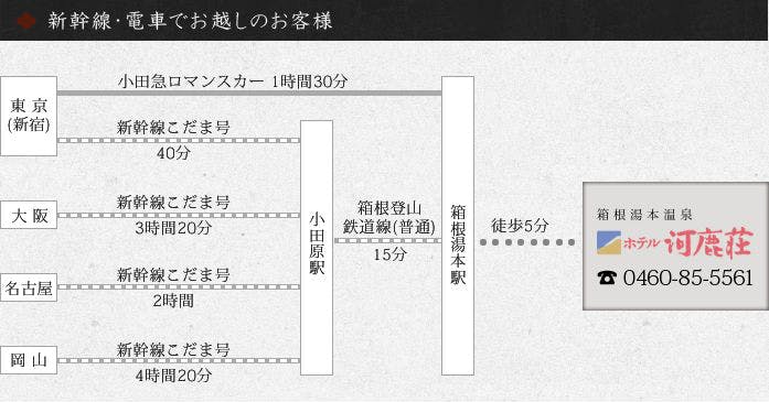 ※箱根湯本駅から徒歩5分 ○新幹線こだま号で小田原まで 東京→小田原【40分】 名古屋→小田原【2時間】 大阪→小田原【3時間20分】 岡山→小田原【4時間20分】 ○箱根湯本まで(電車・バス共に) 小田原→箱根湯本【15分】 ○小田急ロマンスカーで箱根湯本まで 新宿→箱根湯本【1時間30分】 ○お車で(東名高速道路) 厚木IC→小田原厚木道路→ホテル河鹿荘【30分】 大井松田IC→小田原厚木道路→ホテル河鹿荘【40分】 御殿場IC→乙女道路→宮ノ下→ホテル河鹿荘【40分】 沼津IC→国道1号線→箱根新道→ホテル河鹿荘【1時間20分】