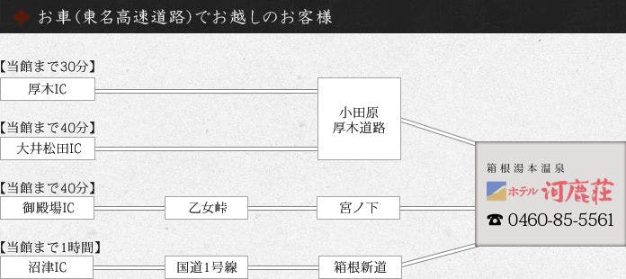 厚木IC→小田原厚木道路→ホテル河鹿荘【30分】