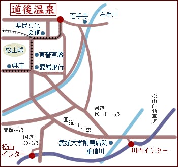 ■道後温泉駅から … 徒歩5分 ■道後温泉本館から … 徒歩3分 ■JR松山駅から … タクシー約15分、市内電車約20分 ■松山観光港から … タクシー約30分、市内バス約40分 ■三津浜港から … タクシー約25分、市内バス約40分 ■松山空港から … タクシー約30分、市内バス約40分