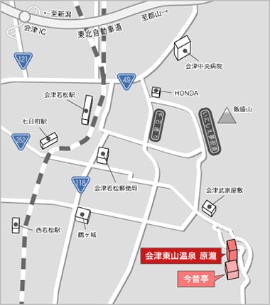■電車の場合 <郡山~会津若松> 磐越西線 1時間30分(快速1時間10分) <東京~会津若松> 東北新幹線・磐越西線 3時間 <仙台~会津若松> 東北新幹線・磐越西線 2時間15分 <新潟~会津若松> 磐越西線 快速2時間10分 <只見~会津若松> 只見線 2時間30分 <鬼怒川~会津若松> 会津鬼怒川線 2時間10分 <川治温泉~会津若松> 会津鬼怒川線 2時間 <喜多方~会津若松> 磐越西線 17分 ・会津若松駅から車で約15分 ■お車の場合 磐越自動車道 会津若松I.C.から車で約20分 ■飛行機の場合 ・福島空港から車で約2時間10分 ・新潟空港から車で約1時間10分