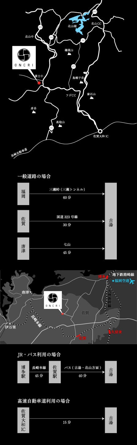 ■お車の場合 福岡より→三瀬峠(三瀬トンネル)60分→古湯 佐賀市内より→30分→ 古湯 唐津より → 七山 45分→ 古湯 ■JR・バス利用の場合 博多駅より→(長崎本線)→佐賀駅(45分)古湯 佐賀駅バスセンター→天河橋バス停(古湯・北山方面・40分) ■高速自動車道利用の場合 佐賀大和I.C →15分→古湯 ■飛行機利用の場合 福岡空港からバスで約60分 佐賀空港からバスで約90分