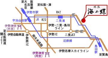 ■お車で ○東京-(東名高速)豊川IC-伊良湖(フェリー)-鳥羽-(R42)旅荘 海の蝶 ○東京-(東名高速)名古屋IC-名古屋西IC-亀山IC-関IC-(伊勢自動車道)伊勢IC-(伊勢二見鳥羽ライン)旅荘 海の蝶 ○松原IC-(西名阪)-天理IC-(名阪国道)関IC-(伊勢自動車道)伊勢IC-(伊勢二見鳥羽ライン)旅荘 海の蝶