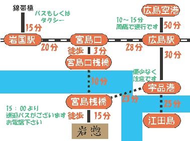 新幹線(のぞみ) ・東京より 3時間47分 ・名古屋より 2時間10分 ・京都より 1時間31分 ・新大阪より 1時間15分 ・博多より 1時間10分 飛行機(広島空港まで) ・札幌より 2時間05分 ・仙台より 1時間35分 ・東京より 1時間15分 ・鹿児島より 50分 ・沖縄より 1時間40分 お車の方へ ・宮島以西からお越しの方は「大野IC」から国道2号線で宮島口桟橋まで約10分です。 ・宮島以東からお越しの方は「廿日市IC」から国道2号線で宮島口桟橋まで約10分です。 ※宮島島内の道は、ところどころ道幅が狭くなっておりますのでお気をつけ下さい。 お車を対岸の宮島口周辺の宮島町営や私設の駐車場におとめになることもご案内します。