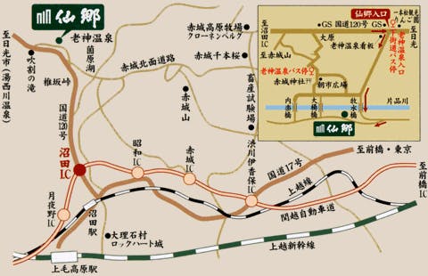 ●お車で 【東京方面から】 練馬I.C(関越自動車道)-沼田I.C(国道120号)-老神 【新潟方面から】 新潟西I.C(北陸自動車道)-長岡J.C.T(関越自動車道)-沼田I.C(国道120号)-老神 【東北方面から】 仙台宮城I.C(東北自動車道)-宇都宮I.C(国道119号・120号)-日光(国道120号)-老神 ●電車で 【東京方面から】 東京(上越新幹線)-上毛高原(路線バス)-老神 上野(上越線)-沼田(路線バス)-老神 【東北方面から】 仙台(東北新幹線)-大宮(上越新幹線)-上毛高原(路線バス)-老神 【新潟方面から】 新潟(上越新幹線)-上毛高原(路線バス)-老神 ●上越新幹線(上毛高原駅)/上越線(沼田駅)から無料送迎バスあり(※事前要予約) 無料送迎バス時刻表(※事前予約要) 上越新幹線上毛高原駅(14:00)→上越線沼田駅(14:20)経由→仙郷(15:00)