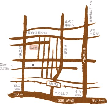 車でお越しの場合:大分自動車道 別府IC→県道52号 20分 電車でお越しの場合:JR日豊本線 別府駅下車 徒歩10分 / タクシー5分 飛行機でお越しの場合:大分空港より タクシーまたはバス40分