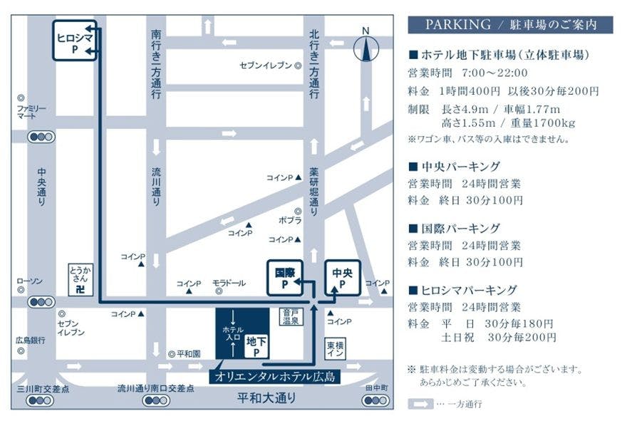 ■JR広島駅より車・バスで7分/市内電車で30分 ■広島空港より車で60分 ■宇品港より車で15分 ■五日市I.Cより車で30分 ■山陽自動車道広島I.Cより車で20分 [広島駅からバスをご利用の場合] 広島駅南側に出て、正面にあるバスの「1番のりば」より市内循環バス「エキまちループ」にご乗車ください。 右回りで3番目(左回りなら8番目)の「田中町」がオリエンタルホテル広島の目の前になります。