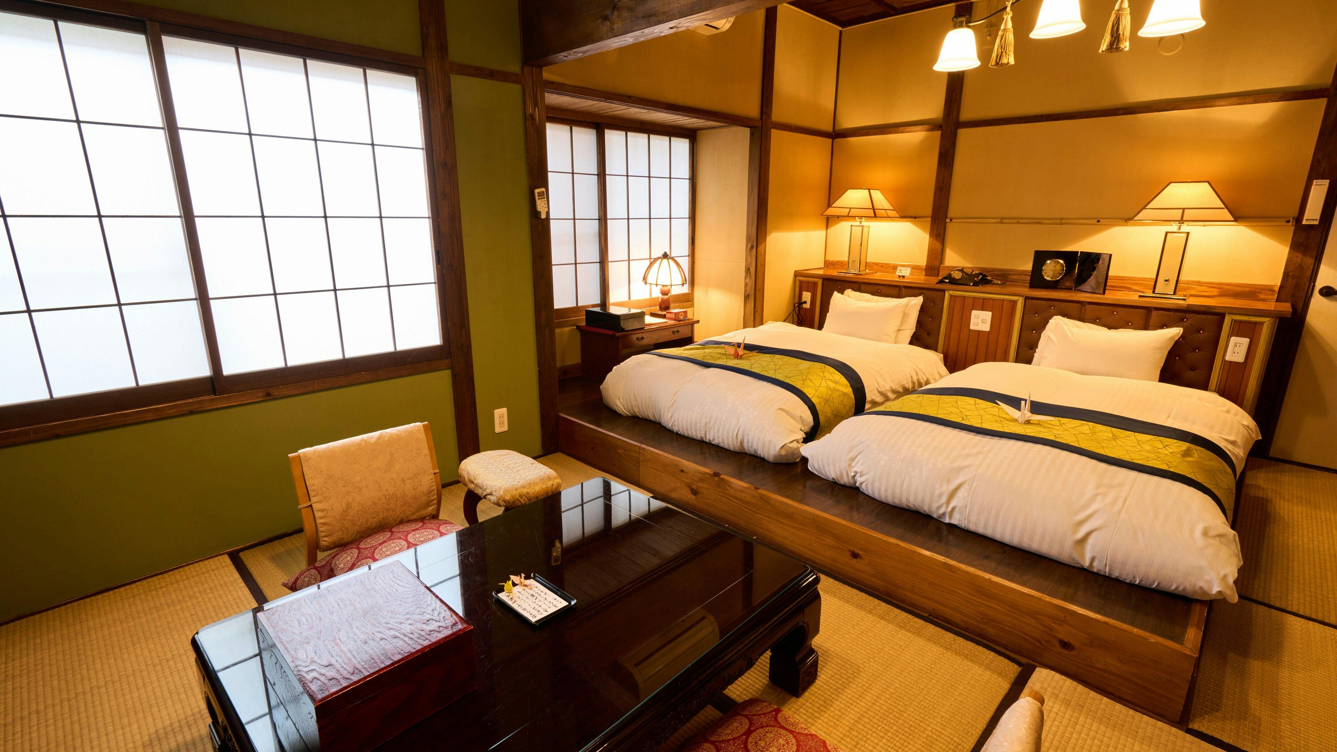 木の質感と土壁の昔なつかしい客室。やわらかな光がしっとりとした雰囲気をかもしだす。 メゾネットタイプ、二間続きの部屋、半露天風呂が付く離れなど客室はそれぞれに趣の異なる造り。