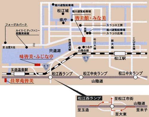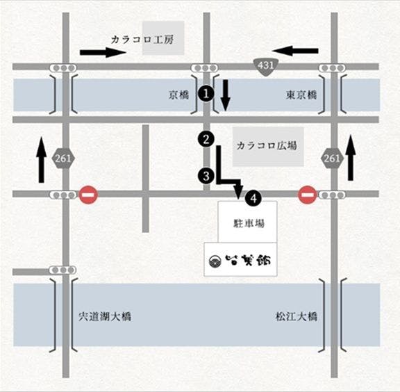 ○出雲空港から・・・バスで50分/タクシーで40分 ○米子空港から・・・バスで60分/タクシーで40分 ○JR山陰本線・・・バスで10分 ●JRにて ○大阪~松江駅(約3時間) ○東京~松江駅(約5時間30分) ○広島~松江駅(約3時間30分) ●お車にて ○瀬戸大橋~松江(約3時間) ○広島~松江(約3時間30分) ■松江中央ランプより10分 ■松江西ランプより松江市街方面へ10分 松江大橋たもと京店通り 京橋を渡って、路地(商店街)をまっすぐ進んでください 突き当りのT字路を左斜めに進んでください ※標識は「右折」と出ていますが、当館までは左折進入OKです