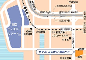 首都高速湾岸線浦安出口より、国道357号線へ合流。約2.5km直進後、「新浦安駅・入船」方面の標識にて左折、ループ上の高架道路に上がり県道242号線へ合流。JR京葉線のガードをくぐり抜けると、約600mでホテルに到着。