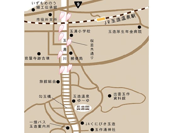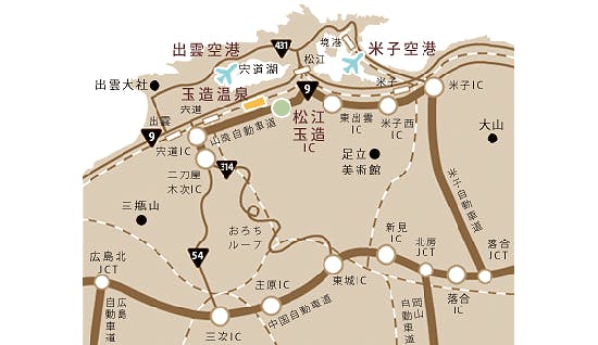 ■電車でお越しの場合 新大阪(のぞみ45分)→岡山(特急やくも2時間29分)→玉造温泉 博多(ひかり37分)→新山口(スーパーおき3時間32分)→玉造温泉 ※8月1日から「玉造温泉駅」間のシャトルバス運行、 詳細は公式ホームページをご覧ください。 ■お車でお越しの場合 大阪(中国自動車道2時間)→落合(米子自動車道50分)→米子(山陰道30分)長楽園 四国(瀬戸大橋/岡山自動車道/米子自動車道2時間)→米子(山陰道30分)→長楽園 広島(広島自動車道/中国自動車道1時間)→三次(R54/R9・2時間)→長楽園 福岡(九州自動車道1時間)→下関(中国自動車道3時間)→三次(R54/R9・2時間)→長楽園 ■飛行機でお越しの場合 【出雲空港まで飛行機でお越しの場合】 大阪(大阪空港)→1時間(1日6往復)→出雲空港 福岡(福岡空港)→1時間10分(1日2往復)→出雲空港 東京(羽田空港)→1時間20分(1日5往復)→出雲空港 ○出雲空港から玉造温泉までタクシーで30分 【米子空港まで飛行機でお越しの場合】 東京(羽田空港)→1時間20分(1日5往復)→米子空港 ○米子空港から玉造温泉までタクシーで60分