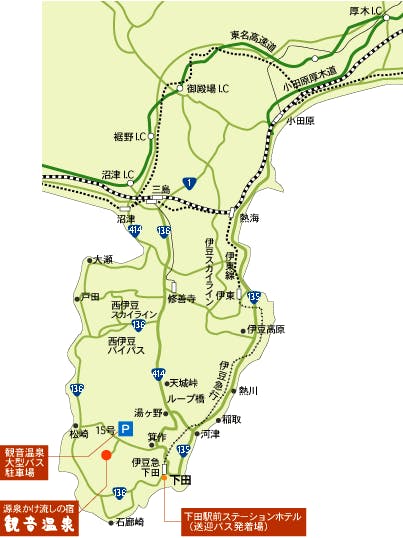 [西海岸コース]沼津I.C-(40分)-修善寺-(40分)-土肥-(40分)-松崎-(20分)-横川バス停左折-(5分)-観音温泉