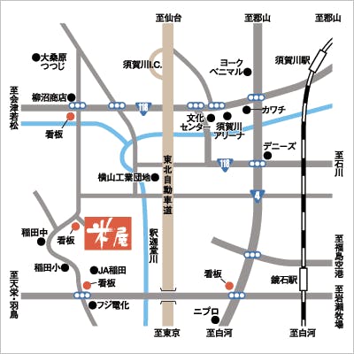 ■新幹線・電車にて 【東北新幹線】 ・郡山駅[乗換]JR東北本線/須賀川駅 TAXIにて15分 ・郡山駅[乗換]JR東北本線/鏡石駅 TAXIにて10分 ・郡山駅 下車 TAXIにて40分 ・新白河駅 TAXIにて45分 ■お車にて 東北自動車道/須賀川ICから118号線を会津方面へ約5分