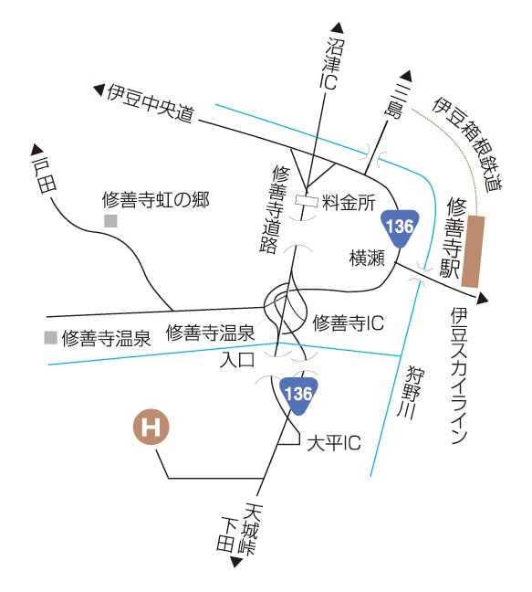 ○東名高速・沼津ICまたは新東名高速・長泉沼津ICより伊豆縦貫道経由、天城北道路・大平ICより約7km。