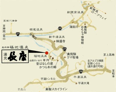 <お車の場合> ●東京から ・中央・長野自動車→松本I.C→R158(安房トンネル)→平湯温泉→福地温泉 ●大阪、名古屋から ・名神高速→一宮JCT→東海北陸自動車道→飛騨清見IC→高山市→R158→平湯温泉→福地温泉 <公共交通機関の場合> ●東京、大阪、名古屋から ・東海道新幹線→名古屋→「高山本線」→高山→「濃飛バス」→福地温泉