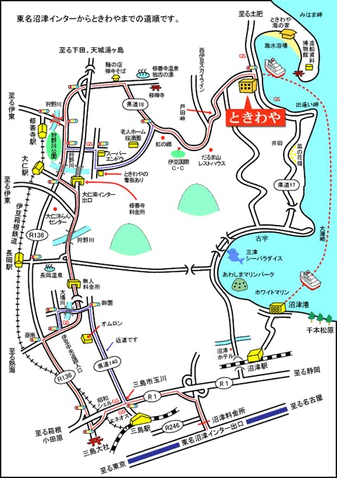 ■電車にて ・東京(特急踊り子号)-修善寺(東海バス)-戸田 約2時間55分 ・名古屋(新幹線)-三島(伊豆箱根鉄道)-修善寺(東海バス)-戸田 約1時間25分 ・新大阪(新幹線)-三島(伊豆箱根鉄道)-修善寺(東海バス)-戸田 約4時間20分 ■お車にて 東名沼津IC-三津-古宇-戸田 約1時間10分 新東名長泉沼津IC-三島-修善寺-戸田 約1時間10分 ■カーフェリーにて 東名清水IC(車)-清水港(カーフェリー)-土肥港(車)-戸田 約 約1時間50分