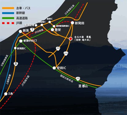 ※新潟西I.Cより新新バイパスで競馬場I.Cを降りて豊栄方面へ。月岡温泉まで40分。