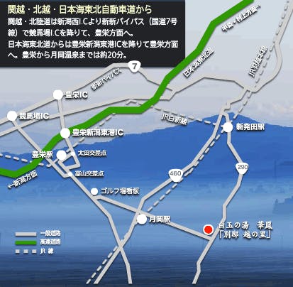 ■電車でお越しの場合 [上越新幹線] 東京駅 → 新潟駅 (1時間40分) [東北新幹線] 仙台駅 → 大宮駅 → 新潟駅 (3時間15分) [JR北陸本線] 金沢駅 → 新潟駅 (4時間) 新潟駅から路線バス → 60分 1,500円 新発田駅から路線バス → 20分 500円 詳しくは公式ホームページをご覧ください ■お車でお越しの場合 [関越自動車道] 東京・練馬I.C → 新潟西I.C (3時間40分) [北陸自動車道] 金沢東I.C → 新潟西I.C (4時間) ※新潟西I.Cより新新バイパスで競馬場I.Cを降りて豊栄方面へ。月岡温泉まで40分。 [磐越道] 郡山I.C → 安田I.C (2時間) ※安田ICより国道290号線を新発田方面へ向かって15分で月岡温泉へ。