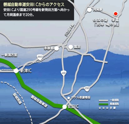 ※安田ICより国道290号線を新発田方面へ向かって15分で月岡温泉へ。