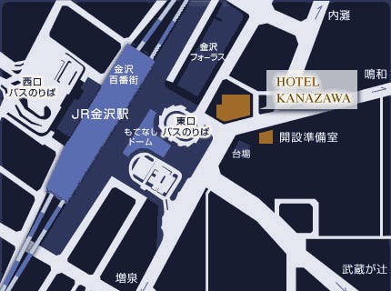 ●金沢駅の兼六園口(東口)から徒歩約1分 ●金沢西インターより車で15分 ●金沢東インターより車で10分 ●小松空港よりバスで50分