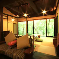 森に包み込まれているような、3棟のはなれ「ふくろう」「かわせみ」「しらさぎ」。 丹精込めて作った無農薬野菜。肥後の赤牛、馬刺しなど 自然の食材をそのままいただける創作料理は、お食事処「いちの川」でご堪能いただけます。