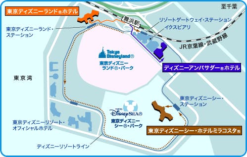 ■車でお越しの場合 首都高速湾岸線利用「浦安出口」から約5分 ※休日など、「葛西出口」の下り出口が混雑する場合がありますので、できるだけ「浦安出口」をご利用ください。 ■電車でお越しの場合 京葉線・武蔵野線「舞浜駅(南口)」下車、徒歩約8分。 ■バスでお越しの場合 全国各主要都市から東京ディズニーリゾート行きのバスが運行しております。 ■飛行機でお越しの場合 ・成田空港から 直通バスで約80分 ・羽田空港から 直通バスで約50分