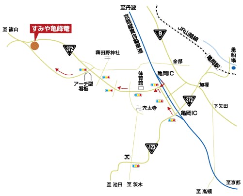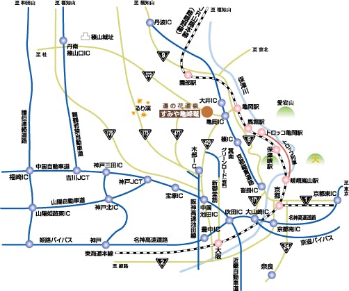 ■東京から 車以外/JR京都駅乗換、嵯峨野線亀岡駅下車タクシー15分 車/東名高速~名神高速大山崎JC~京都縦貫道(沓掛IC)~亀岡IC下る~3つ目の信号を左折2~3分で湯の花温泉の看板を左折2分位 ■大阪から 車以外/JR京都駅から嵯峨野線(約30分)亀岡駅下車バス15分(送迎有) 車/阪神高速池田線、木部出口から国道423号線へ~木部 出口~423号線を亀岡方向へ約40分、亀岡IC附近信号を左折7分位 ■JR亀岡駅からの送迎※ご予約制 ・迎え(14:55/15:55/16:55/17:55) ・送り(9:00/10:00/11:00) ご予約のない便は、運行いたしません。必ず事前にご予約くださいませ。
