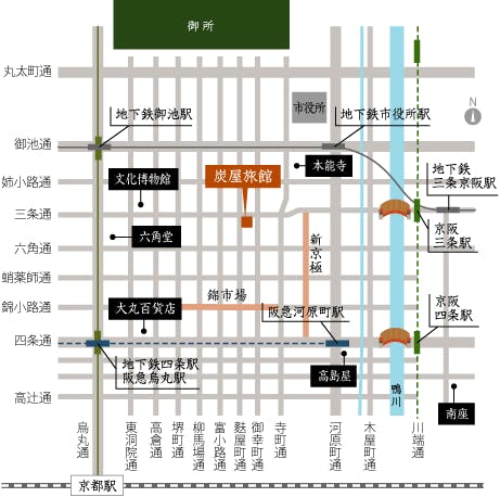 ■電車でお越しの場合■ ○地下鉄 ・烏丸線 烏丸御池駅下車 徒歩約10分 ・東西線 市役所前駅下車 徒歩約5分 ○京阪電車 ・三条駅下車 徒歩約10分 ○阪急電車 ・烏丸駅下車 徒歩約10分 ※JR京都駅からタクシーで約15分