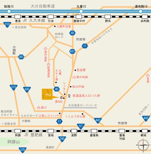 ■福岡市内から高速道路使用 (大分自動車道ー九重IC)・・・約2時間30分 ■熊本市内から車で・・・約1時間40分 ■別府市内から車で・・・約1時間30分 ■黒川温泉まで車で・・・約10分 ■湯布院まで車で・・・約1時間