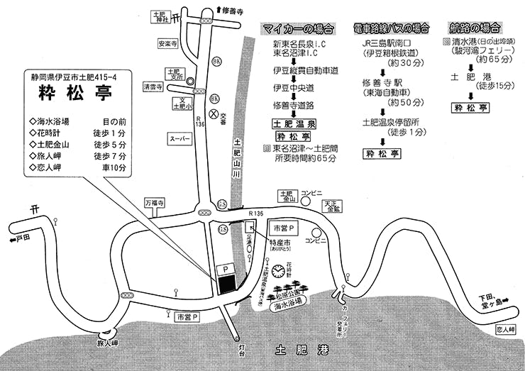 ■マイカーの場合 東名沼津I.C → 国道1号線 → 国道136号線 → 伊豆中央道 → 修善寺道路 → 船原トンネル → 土肥温泉(東名沼津~土肥間所要時間約65分) ■電車路線バスの場合 JR三島駅南口(伊豆箱根鉄道 約30分) → 修善寺駅(東海自動車 約45分) → 土肥(バス停 徒歩1分) ■航路の場合 清水港(駿河湾カーフェリー 約65分) → 土肥港(徒歩15分)