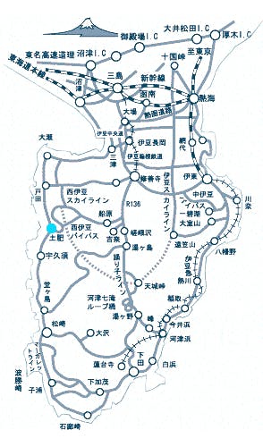 東名沼津I.C → 国道1号線 → 国道136号線 → 伊豆中央道 → 修善寺道路 → 船原トンネル → 土肥温泉(東名沼津~土肥間所要時間約65分)