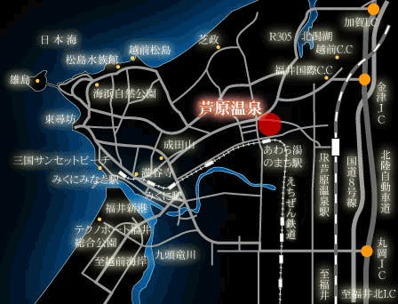 ■東京からJR芦原温泉駅まで ・JR新幹線・米原経由特急で・・・・・・・・・約4時間 ・自動車 東名・名神・北陸自動車道で・・・・約7時間 ・飛行機 羽田~小松~JR~芦原・・・・・・・約2時間 ■大阪からJR芦原温泉駅まで ・JR湖西線特急で・・・・・・・・・・・・・・約2時間 ・自動車 名神・北陸自動車道・・・・・・・・約3時間 ■名古屋からJR芦原温泉駅まで ・JR北陸特急で・・・・・・・・・・・・・・・約2時間30分 ・自動車 名神・北陸自動車道で・・・・・・・約2時間30分 ※JR芦原温泉駅からタクシーで10分 ※JR芦原温泉駅までのお迎え有り。(無料/15:00~19:00要事前予約)