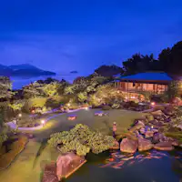 宮島と瀬戸を眼下に、1500坪の庭園を囲む数寄屋の離れ座敷が連なる宿