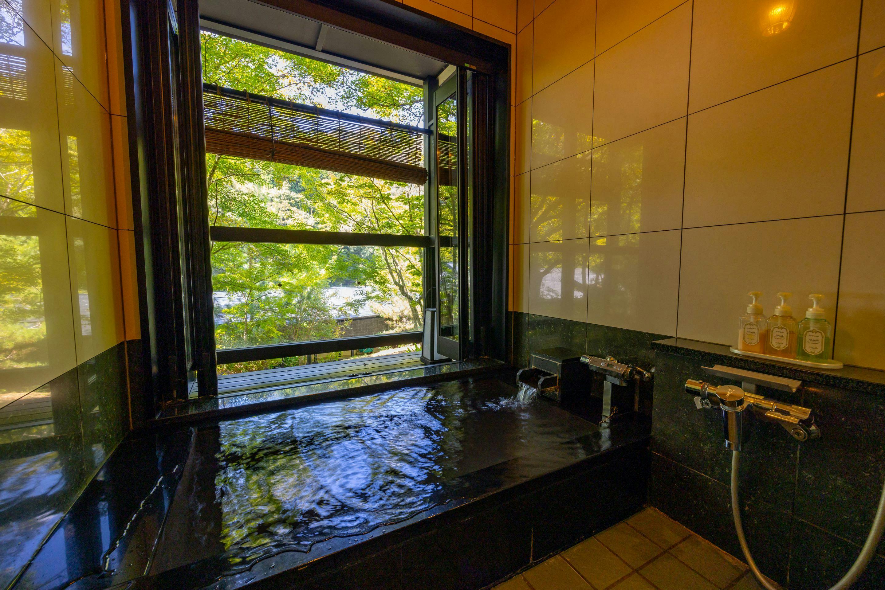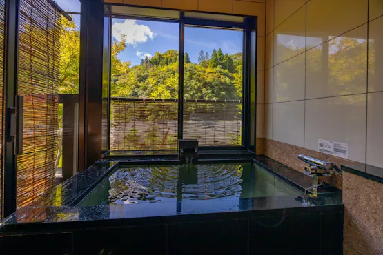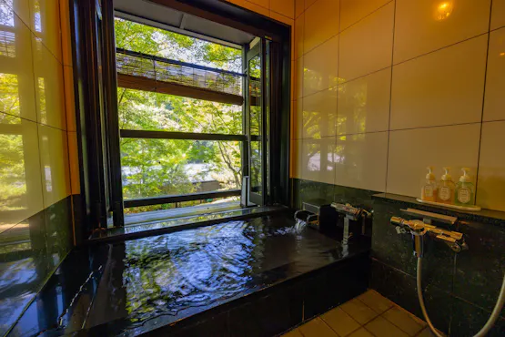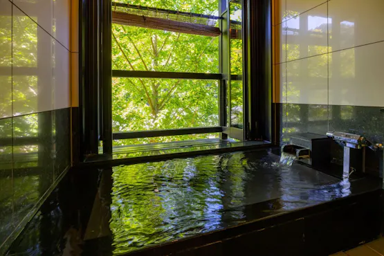 源泉かけ流しの温泉は、関西でもめずらしいラドン含有の泉質。お肌がすべすべ、心とからだに潤いが広がります。露天風呂からは、武庫川の渓流を望む渓谷美をお愉しみいただけます。