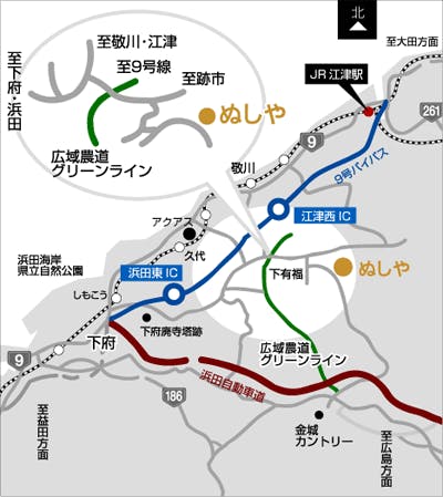 【お車でお越しの場合】 中国自動車道→千代田JCT→浜田自動車道→浜田JCT→山陰江津道路→浜田東ICから7km約20分 または江津西ICから5km約15分 【飛行機でお越しの場合】 広島空港からお車で約1時間40分 出雲空港からお車で約1時間40分 萩石見空港からお車で約1時間30分 【新幹線でお越しの場合】 JR広島駅新幹線口から車で約1時間50分、または定期高速バスで約3時間 JR浜田駅から車で約25分 JR江津駅から車で約20分、また平日のみ江津バス生活バス江津有福線「有福温泉」下車徒歩5分