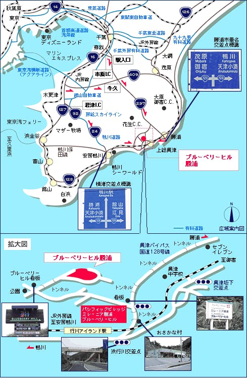 ○川崎方面→東京湾横断道路(アクアライン)→92号線(房総スカイライン経由)→24号線(鴨川有料道路経由)→安房鴨川経由国道128号線→ホテル
